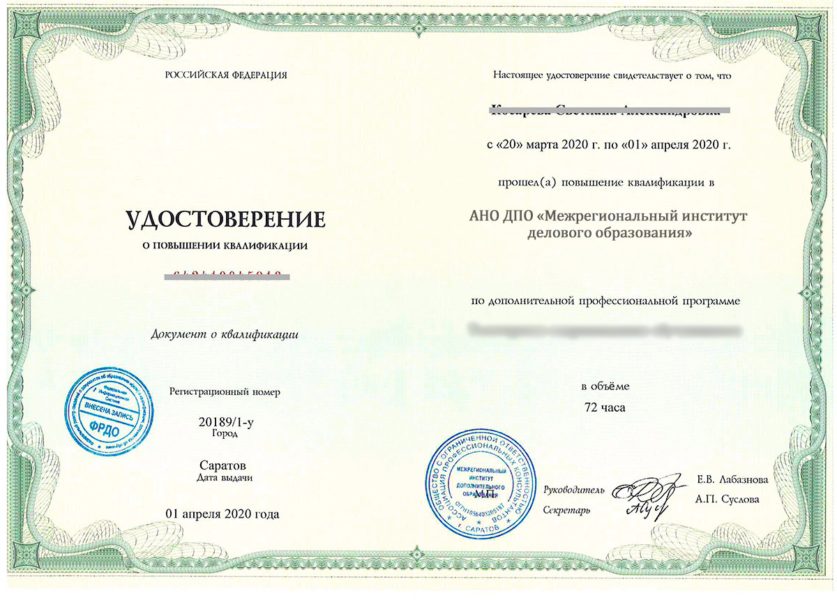 Удостоверение о повышении квалификации с занесением в Федеральный реестр документов об образовании (ФРДО).